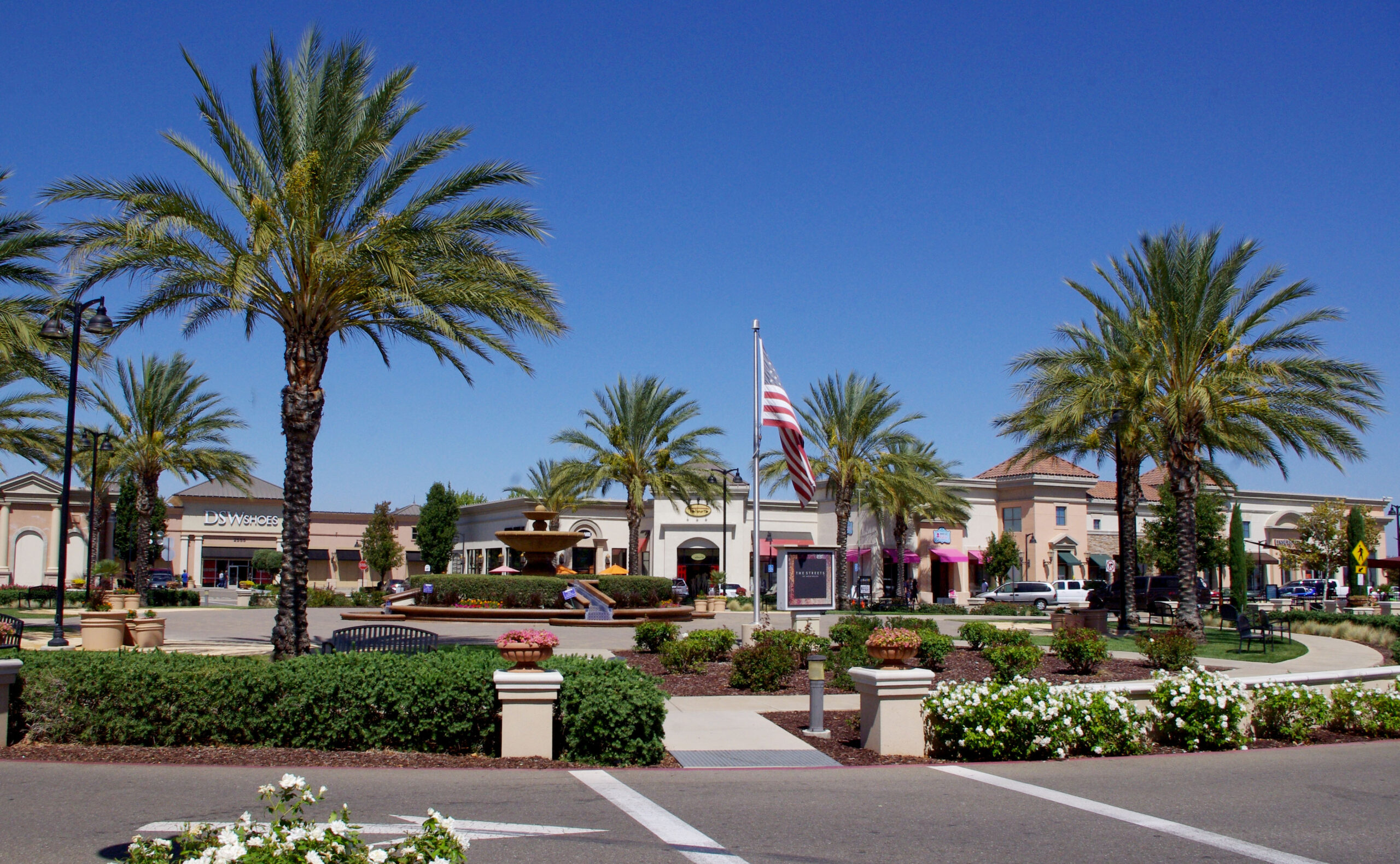Streets of Brentwood is a “Main Street” concept lifestyle center. The retail shops are located in clustered buildings that front streets with parking, creating a downtown main street atmosphere highlighted by a center green. The center green features open pedestrian spaces, themed fountains and restaurant buildings. Streets of Brentwood includes approximately 417,000 square feet of retail and theater space on a 54 acre site. The project architecture and planting are Mediterranean in nature, while hardscape elements include terra cotta pots, “old world charm” stone pavers and themed fountains.