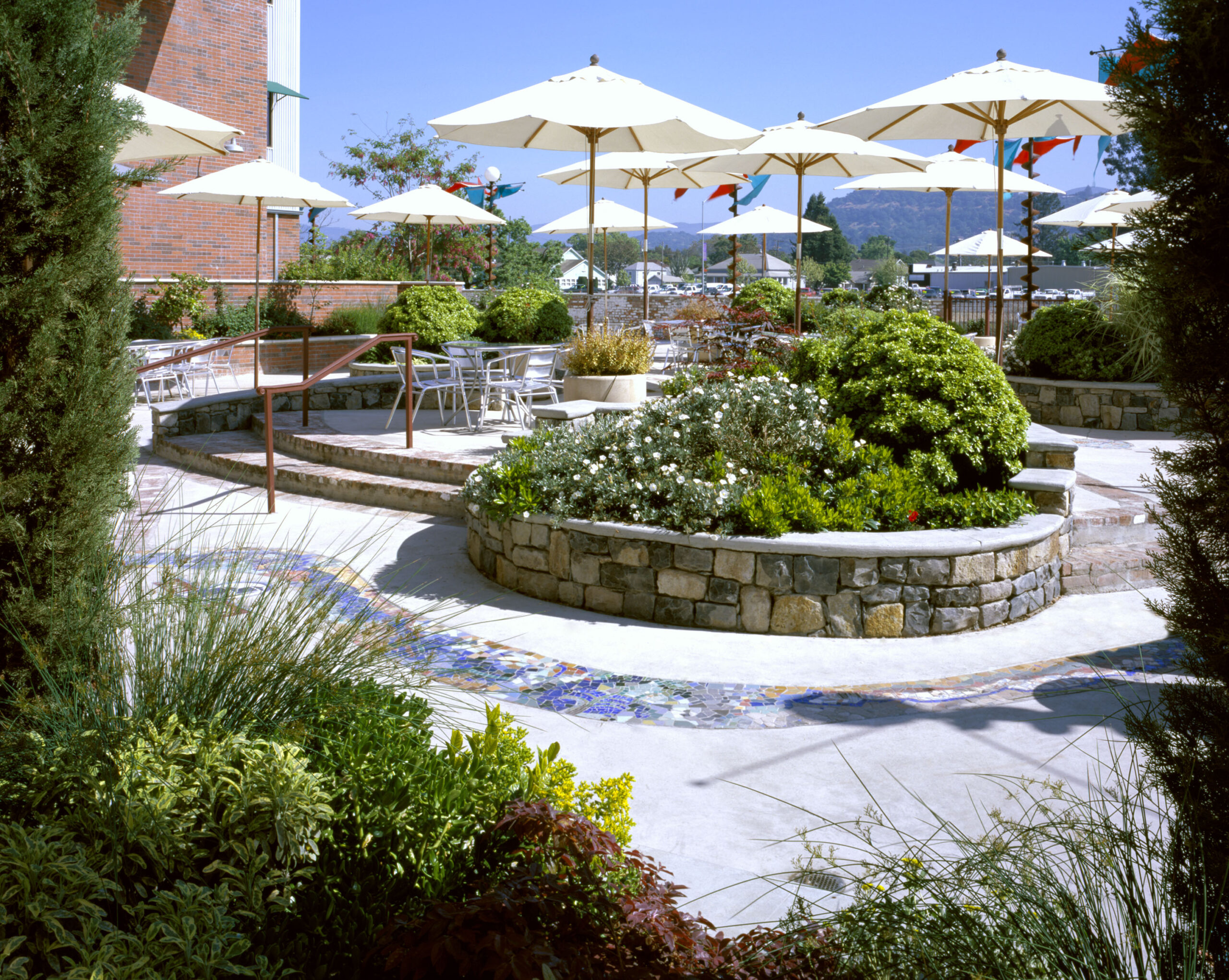 Napa Square is the renovation of a city block and expansion of city offices into an adjacent renovated building and a new Class ‘A’ office building. Napa Square includes a pedestrian plaza with seatwalls, palms, shade trees, and tiered water feature. This development, on the edge of downtown, provides an anchor for city services and a much needed space for outdoor community activities.