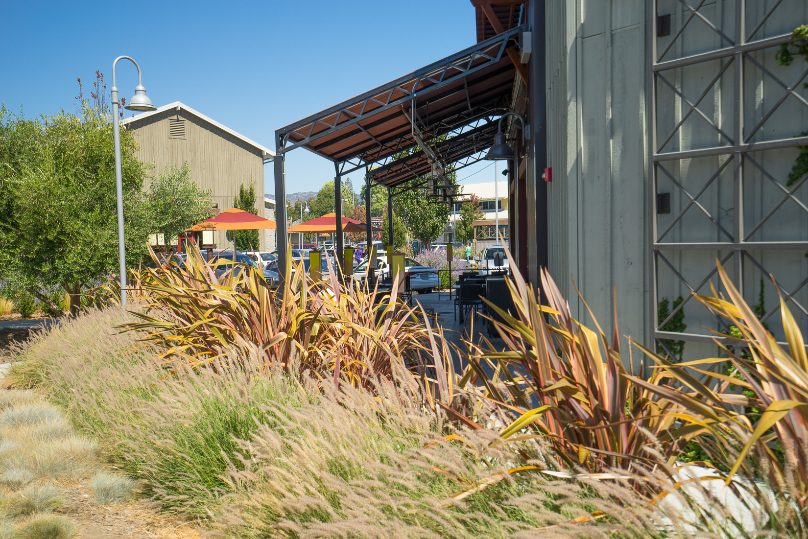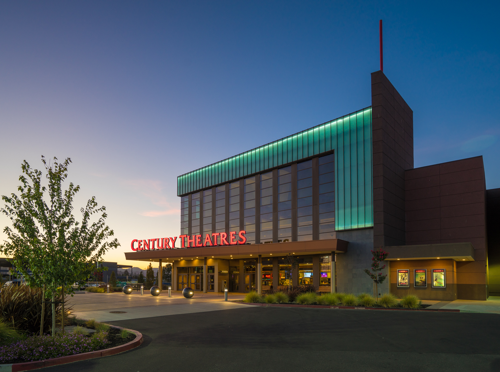 The South Napa Century Center is a 7.7 acre property located in south Napa along the picturesque Napa River. The project area includes a theater, hotel, health club, restaurants, and retail. The landscape is a contemporary theme utilizing drought tolerant plants in colors and textures that complements the project architecture. The Napa Century Theater is the first movie theater in California designed to meet LEED certification. The irrigation was designed to utilize rainwater harvesting from onsite and neighboring properties which is stored in underground cisterns.