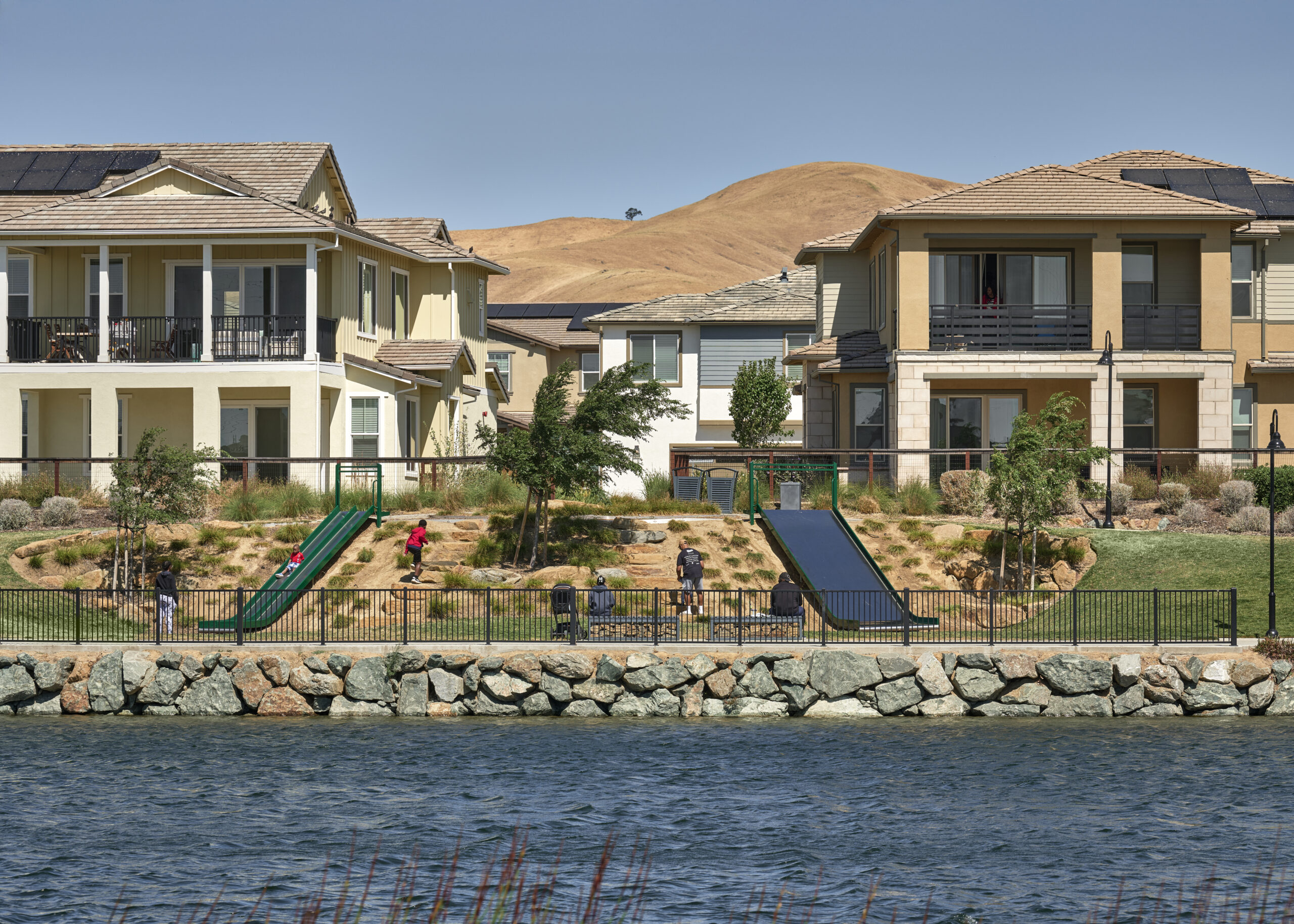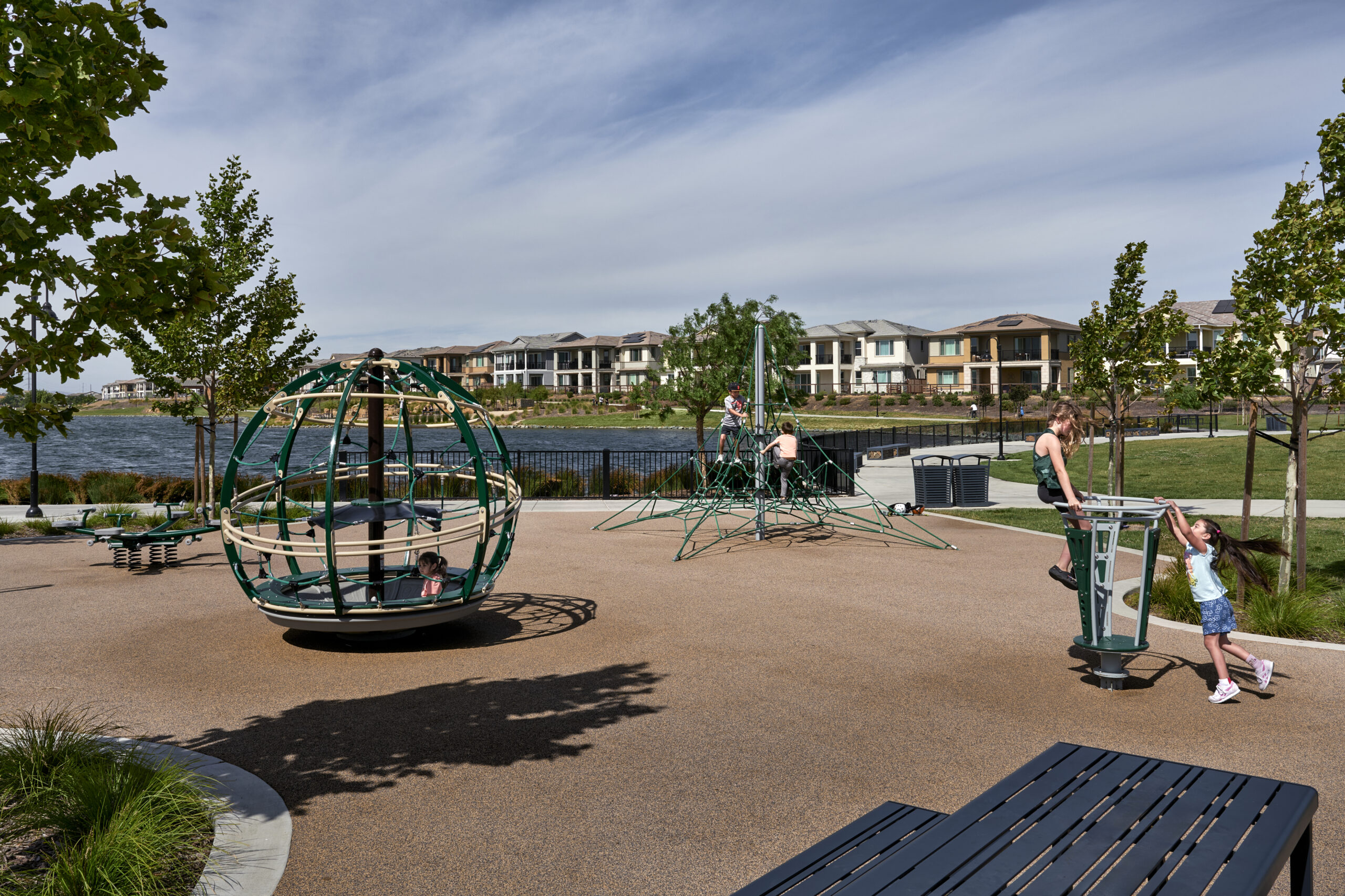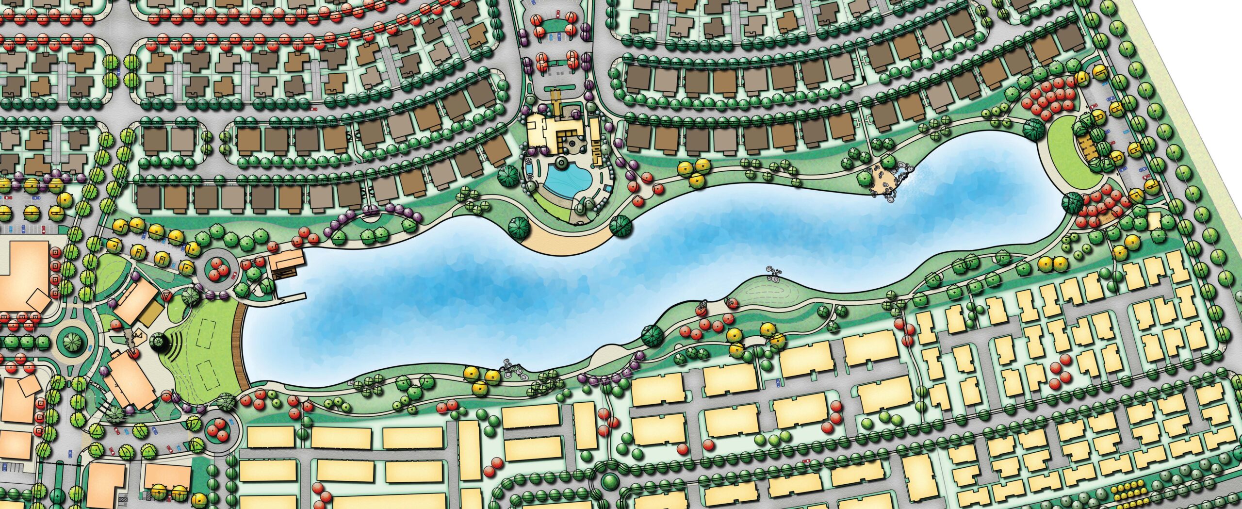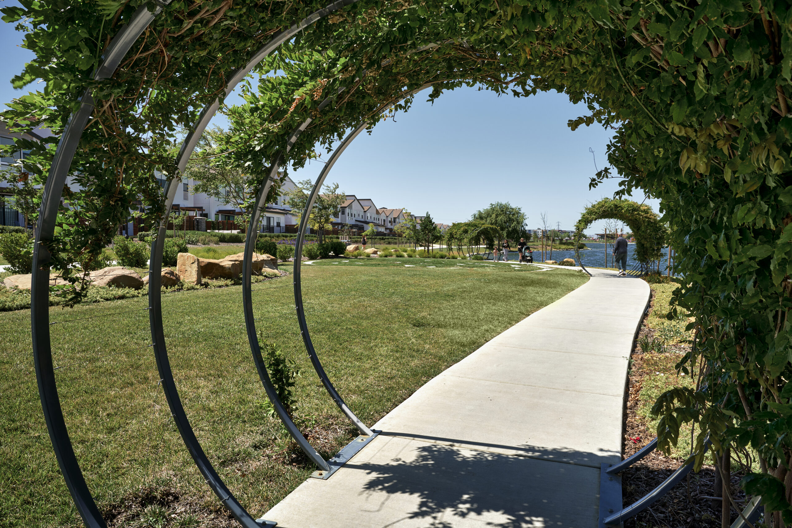 Lake District is a public park that includes interconnecting trails and a ten-acre lake with exciting amenities. The extensive trail system promotes a healthy living atmosphere that draws the community to the social gathering spaces provided. Waterfront activities take place at the iconic lake and encourage an active and social lifestyle. The cafe, eateries, and outdoor spaces surrounding the park enhance the organic, modern and engaged new lifestyle.